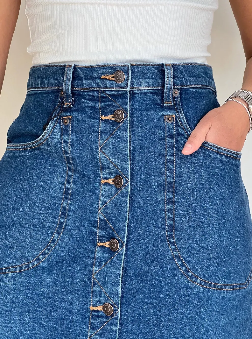 The denim skirt, a wardrobe staple, has been revisited by our team to offer unique comfort and style. This essential will instantly enhance any outfit!