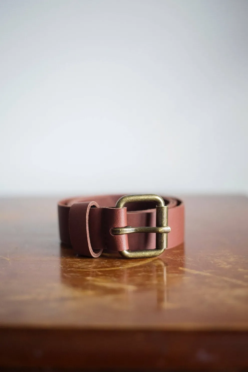 Genuine leather belt from Canada. 26mm wide with an antique bronze colored metal buckle.