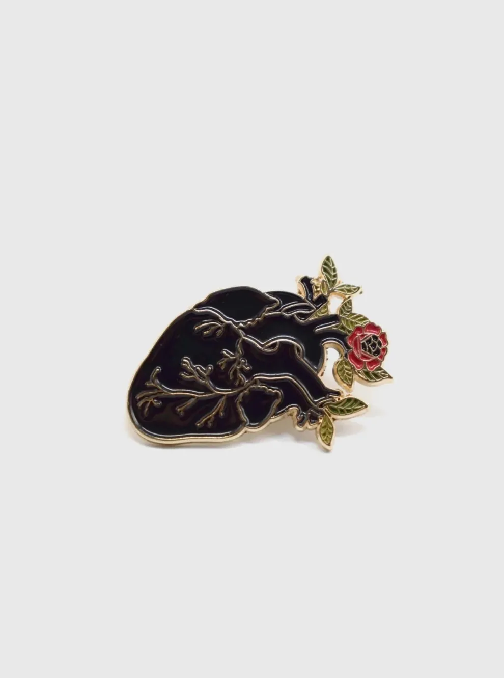 Soft enamel pin with gold outline, backing and rubber sleeve.