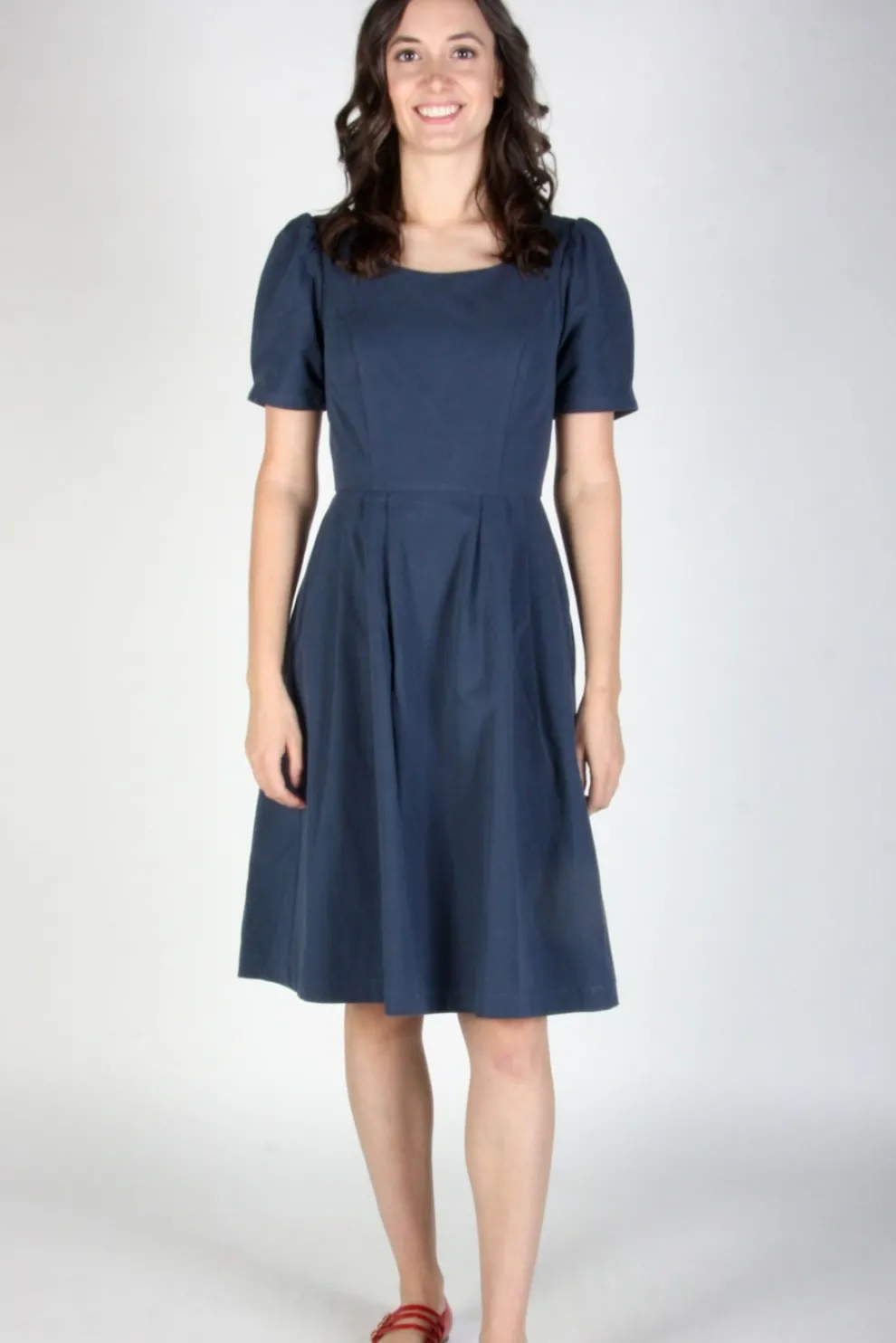 This fabric has no stretch and will shrink very little when washed. The dress can be hand washed or machine washed on cold, gentle cycle, then hung to dry. The body of the dress is 100% organic cotton and the skirt is lined with soft satin made of 97% polyester and 3% elastane