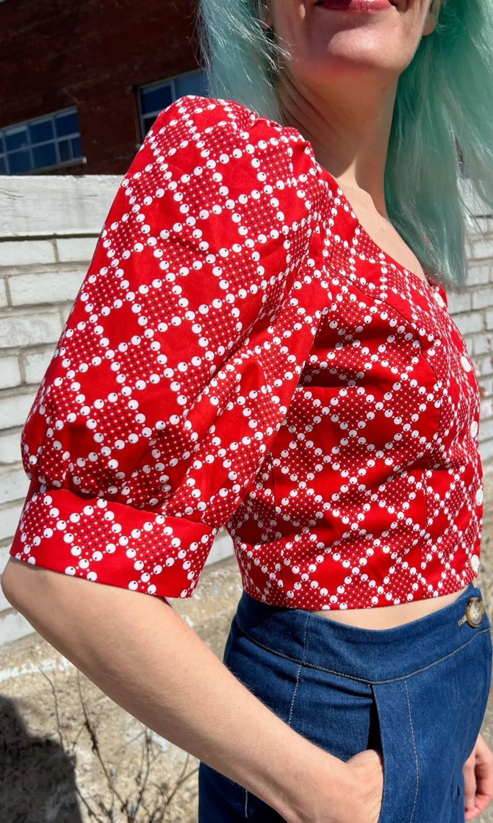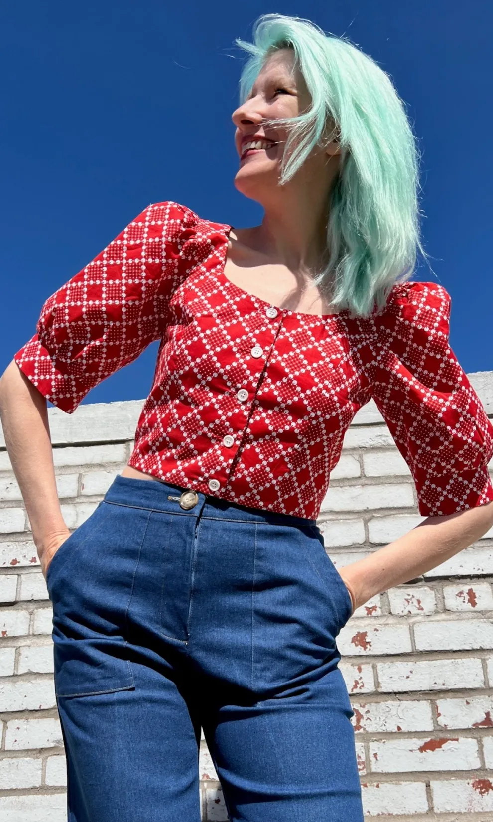 Stonechat is a scoop neck, button front top with cute puffed, cuffed sleeves!