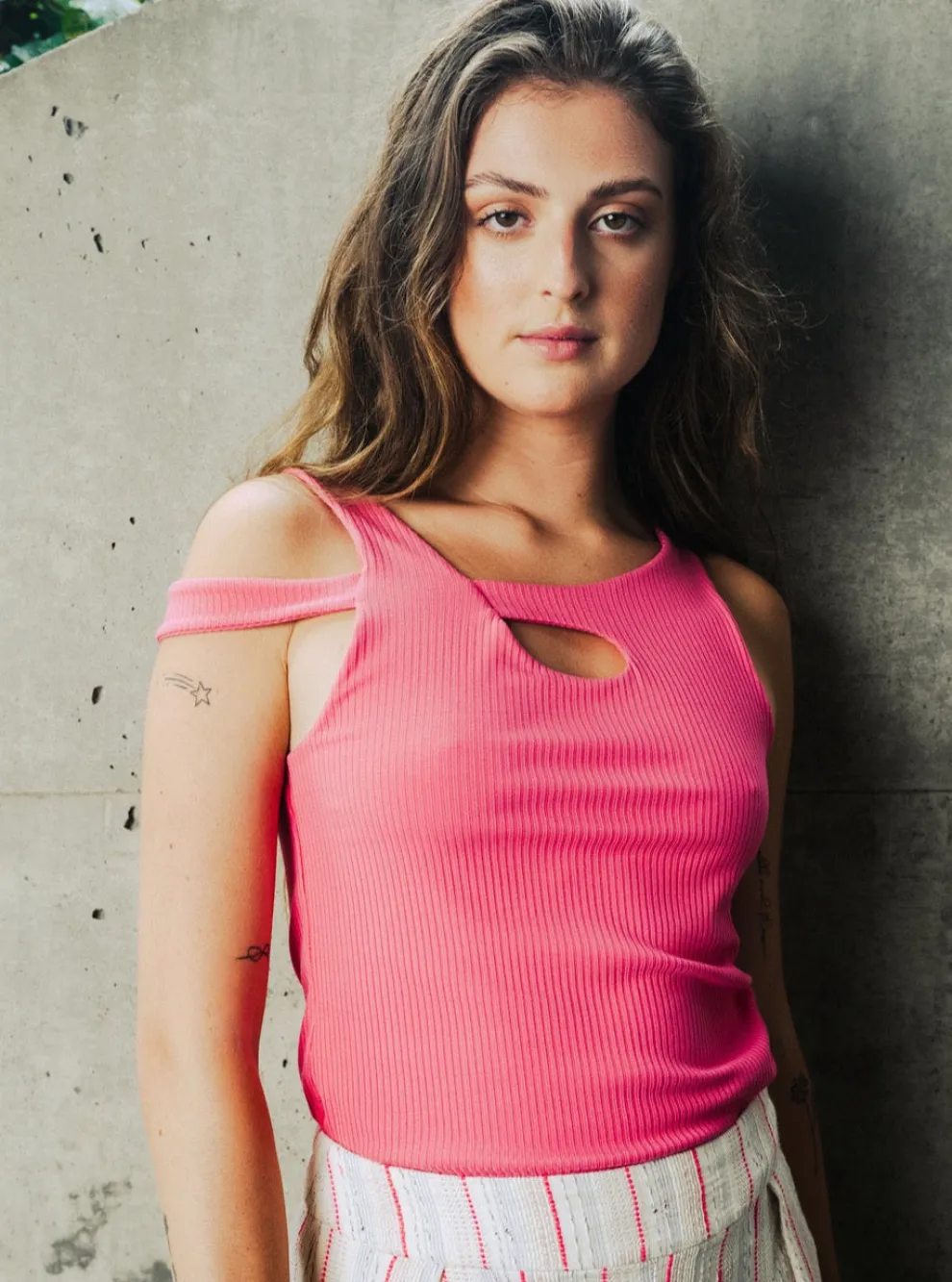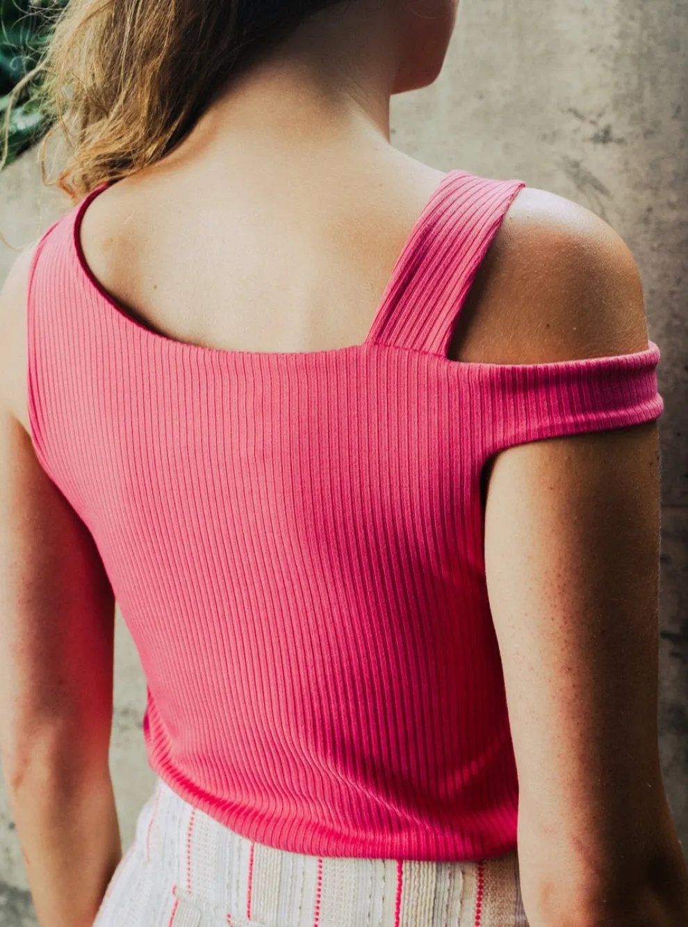 Double layer camisole. With fancy crossover details at the neckline and on one shoulder.