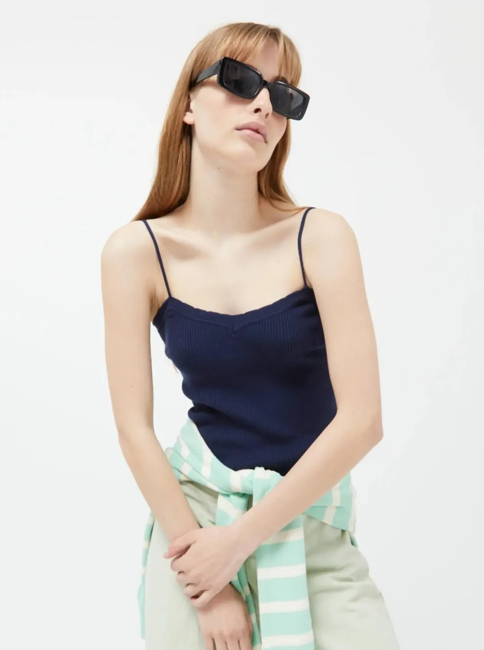 Navy blue ribbed knit top. With a V-neckline and thin straps. Piping detail on the chest.