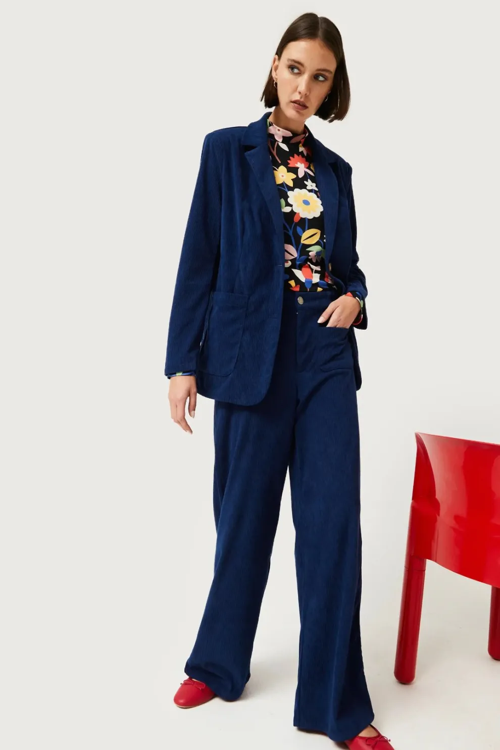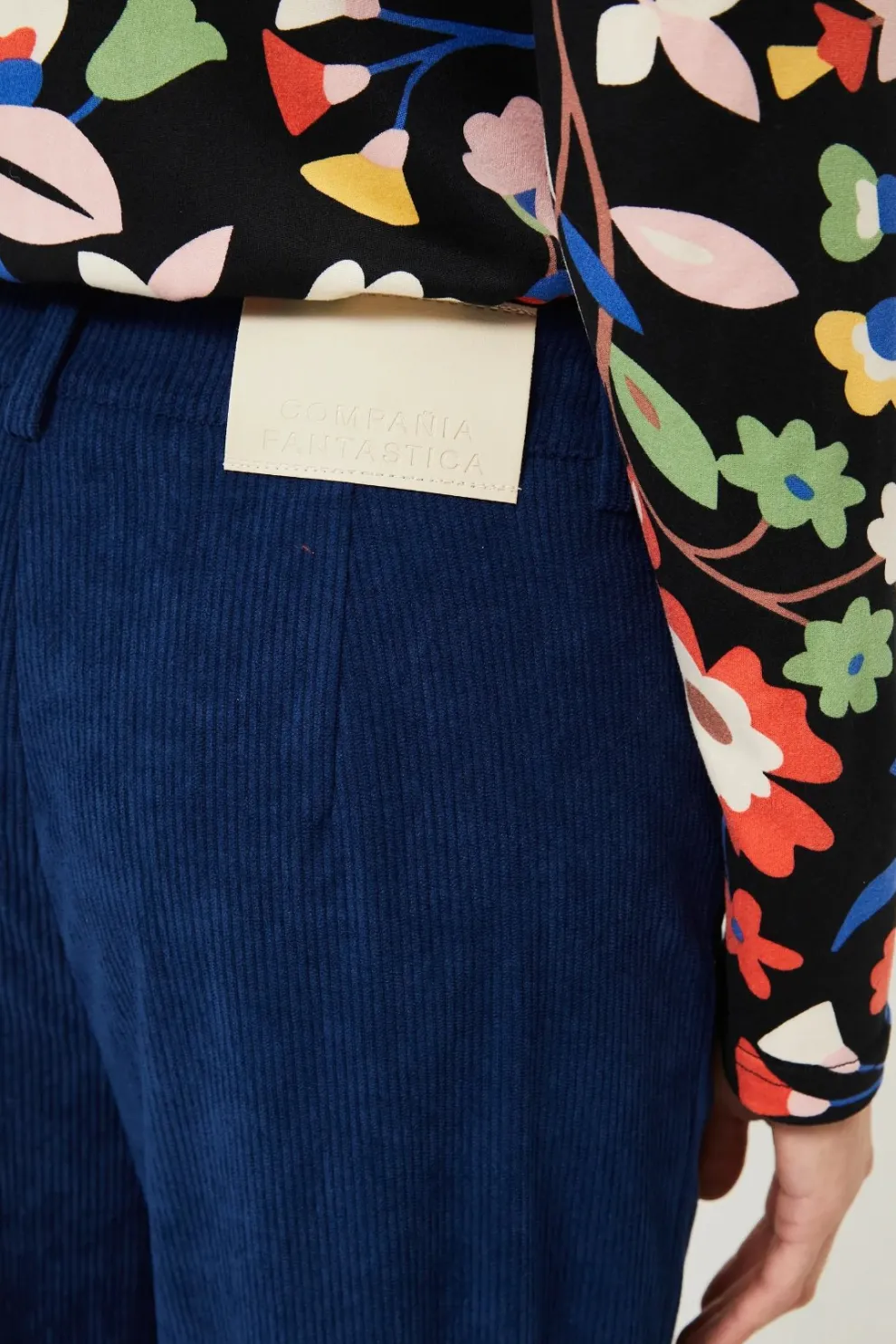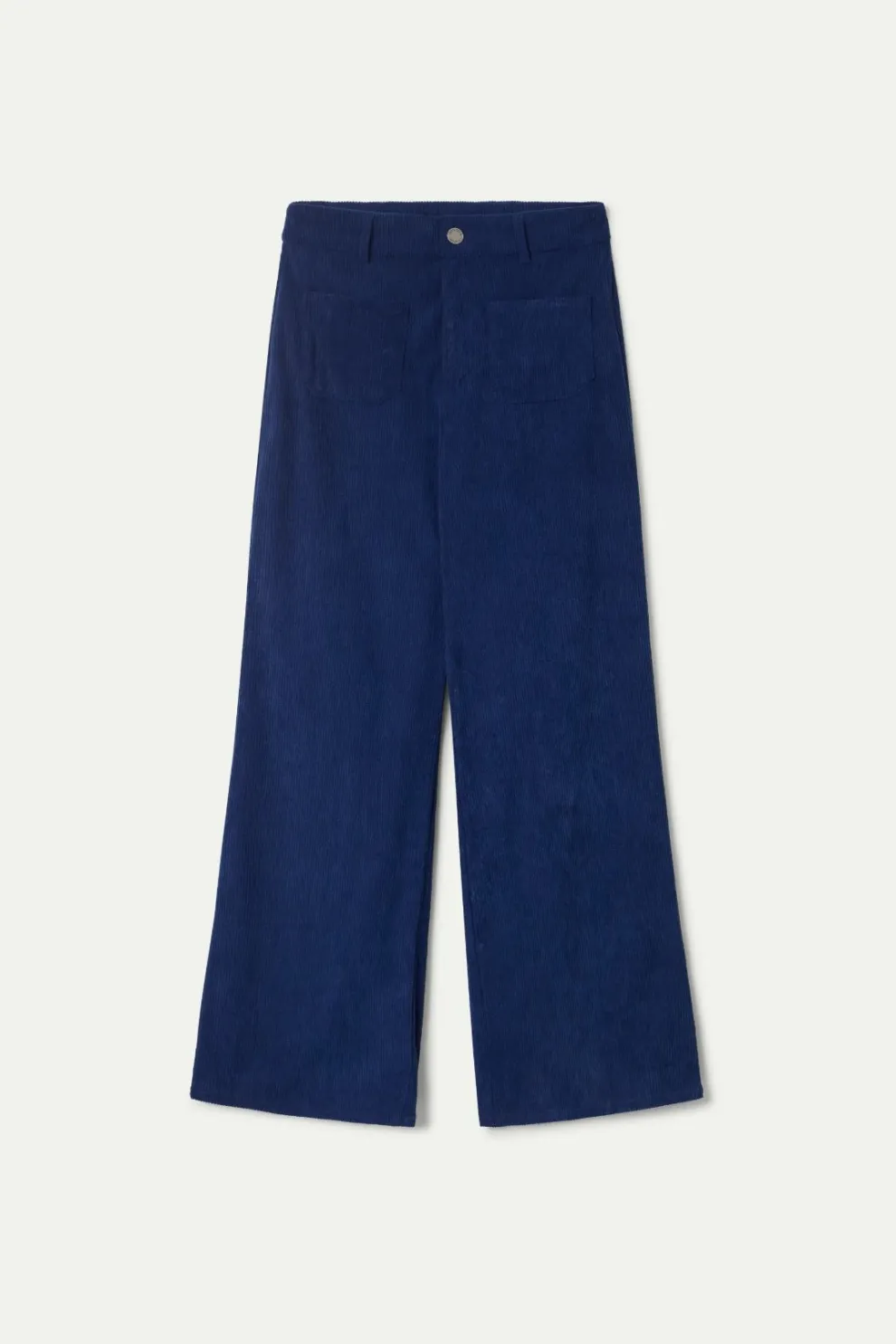 Navy corduroy long pants. Mid-rise and straight leg. Button and zip fastening. Front pocket detail and belt loops.