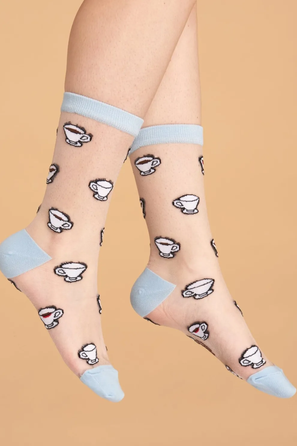 Sheer socks with a little coffee cup pattern. We love the detail of the lipstick marks, so typical, and its pretty sky blue ends.