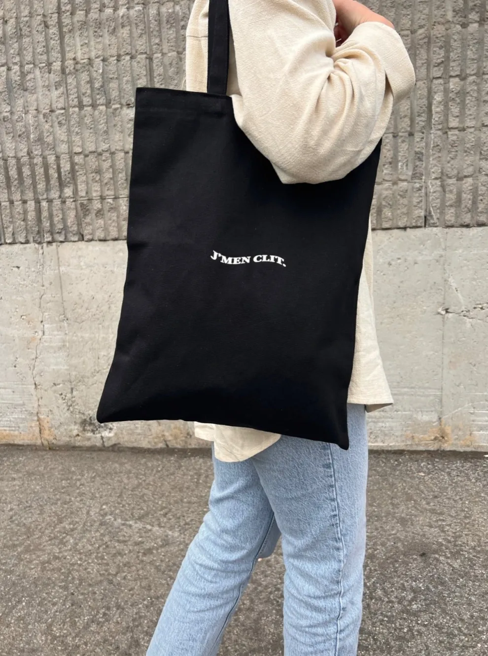 A new bag in a neutral color with our eponymous phrase J’men clit on the front! It will be the accessory of choice for carrying your shopping or for storing all your essentials.