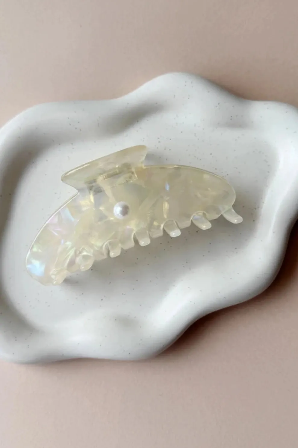 Pearl colored hair clip with embedded pearl. It will hold all types of hair in place.