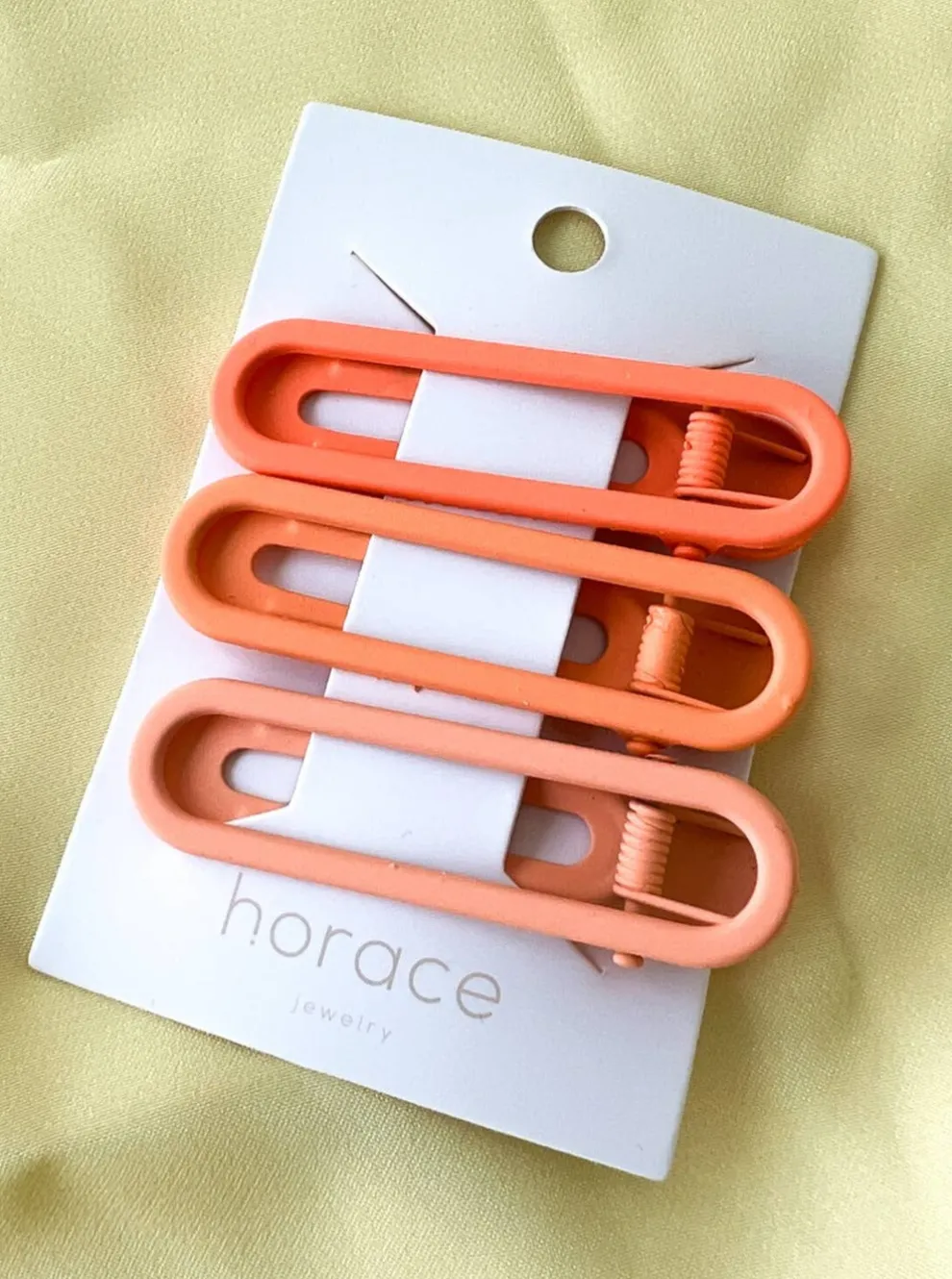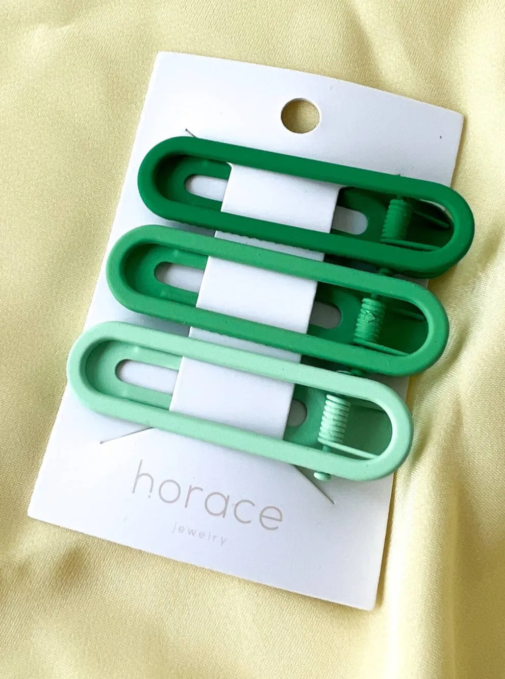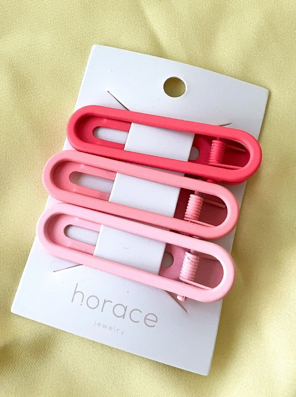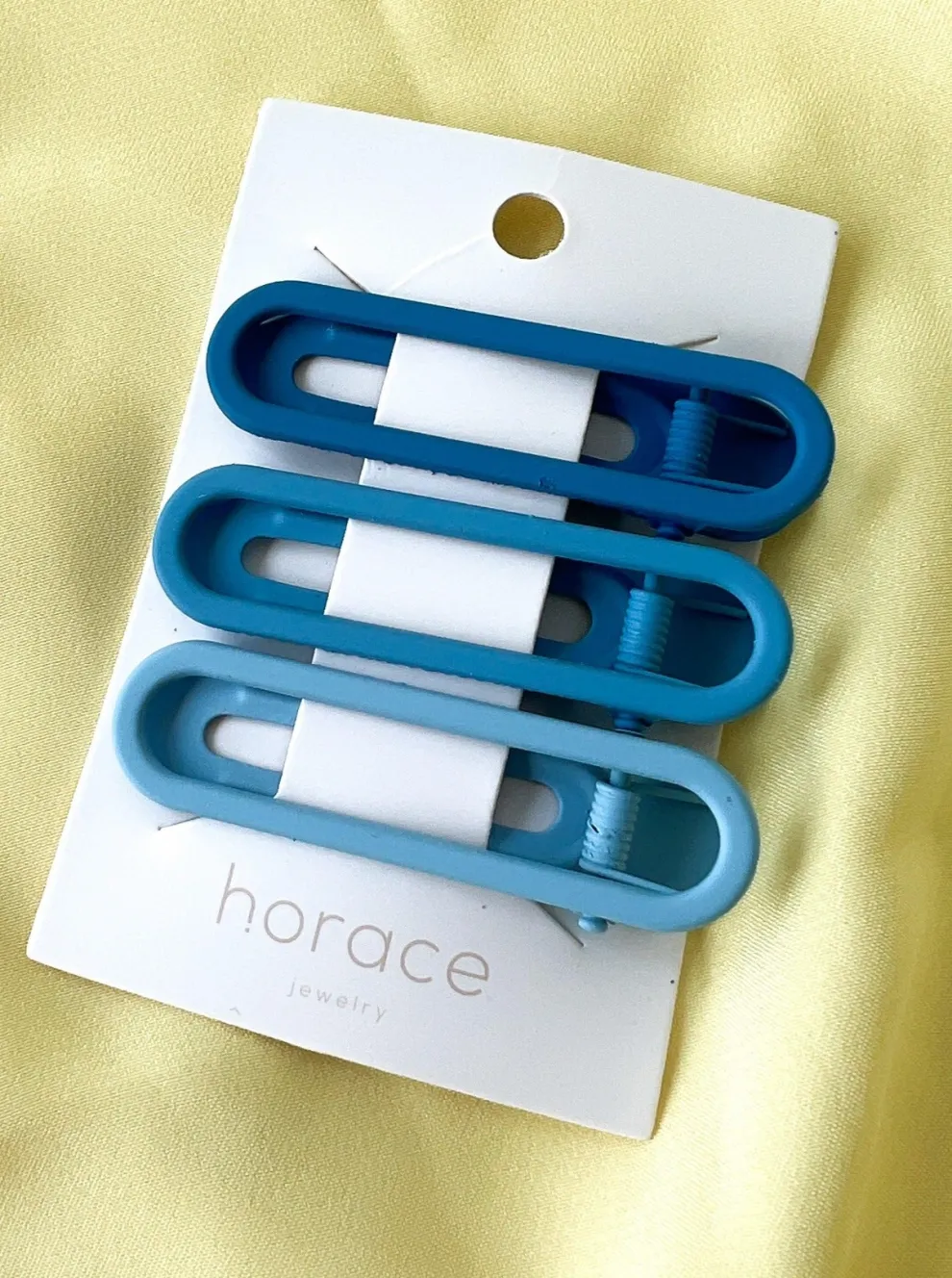 Rectangular matte finish metal hair clips with rounded ends in three gradient colors. Three hair clips per pack.