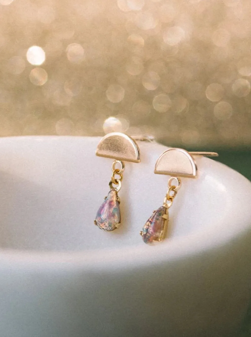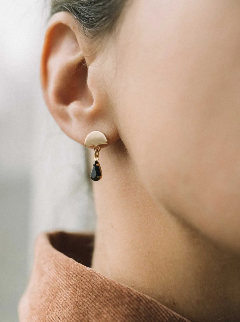 Half-circle earrings on stem with pink opal or black glass drops (vintage cabochons). Gold-plated brass.