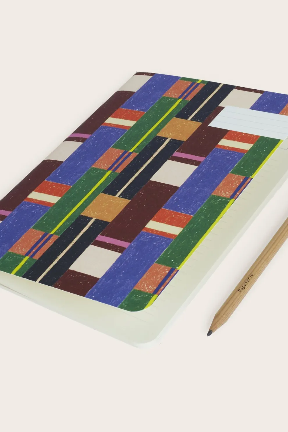 Weaving, a pattern of crossed lines with muted and bright colors that brings rhythm to your life. Use it on your desk or slip it into your bag, this notebook will quickly become an essential.